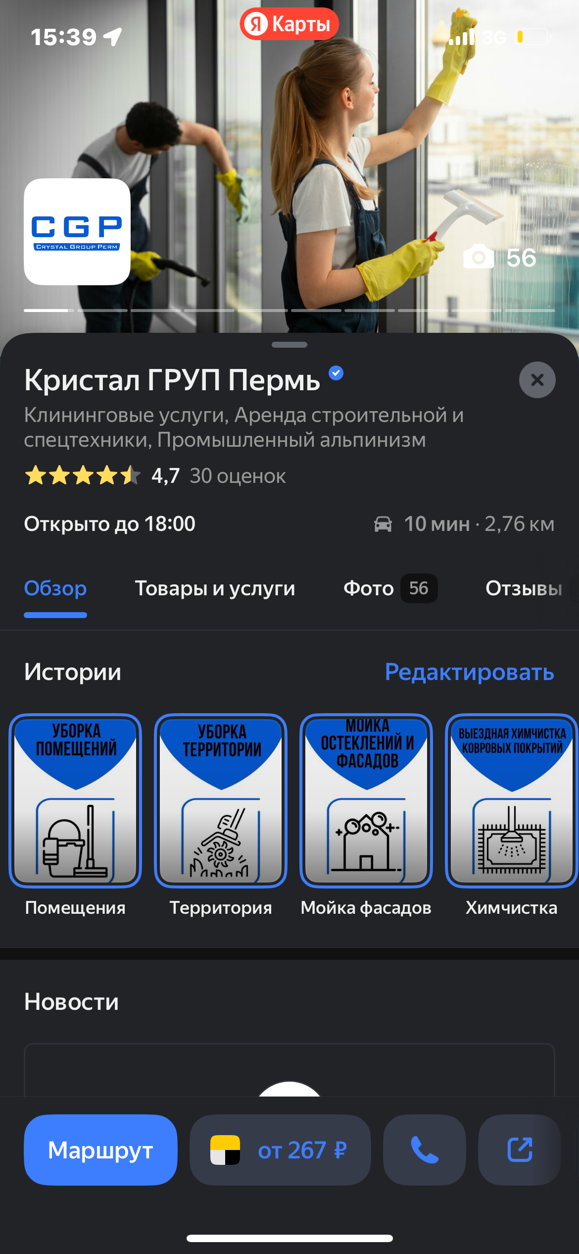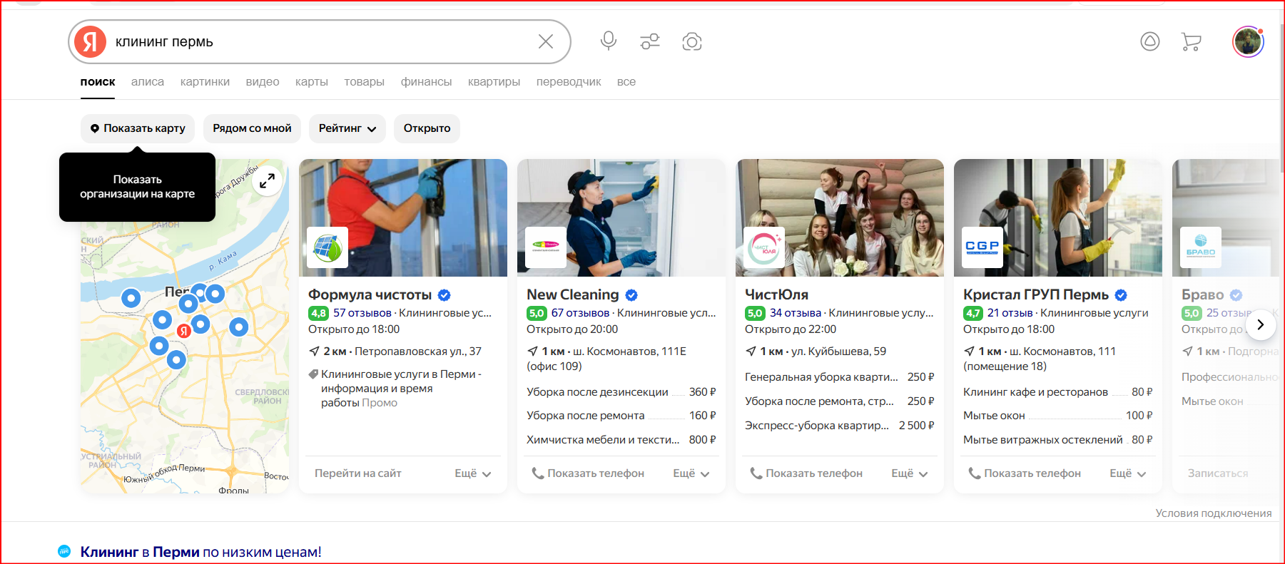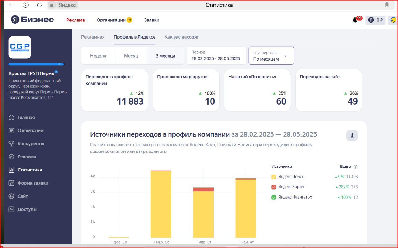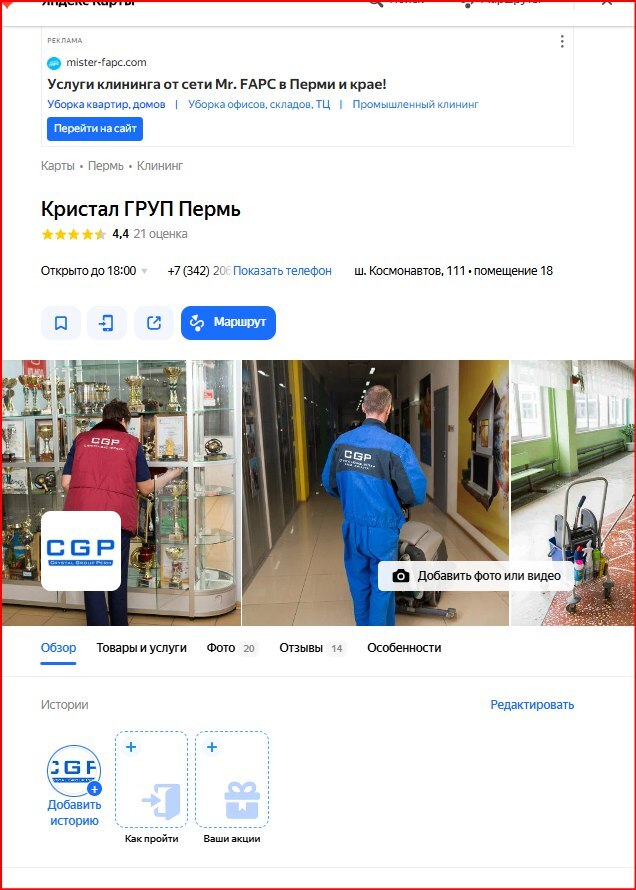Компания «Кристал ГРУП Пермь» (профессиональный клининг) не попадала в ТОП-10 по ключевым запросам. Низкая активность в карточке — мало переходов и звонков. Компания хотела укрепить позиции в ТОПе Яндекса.
